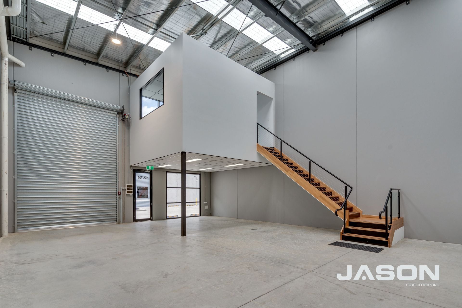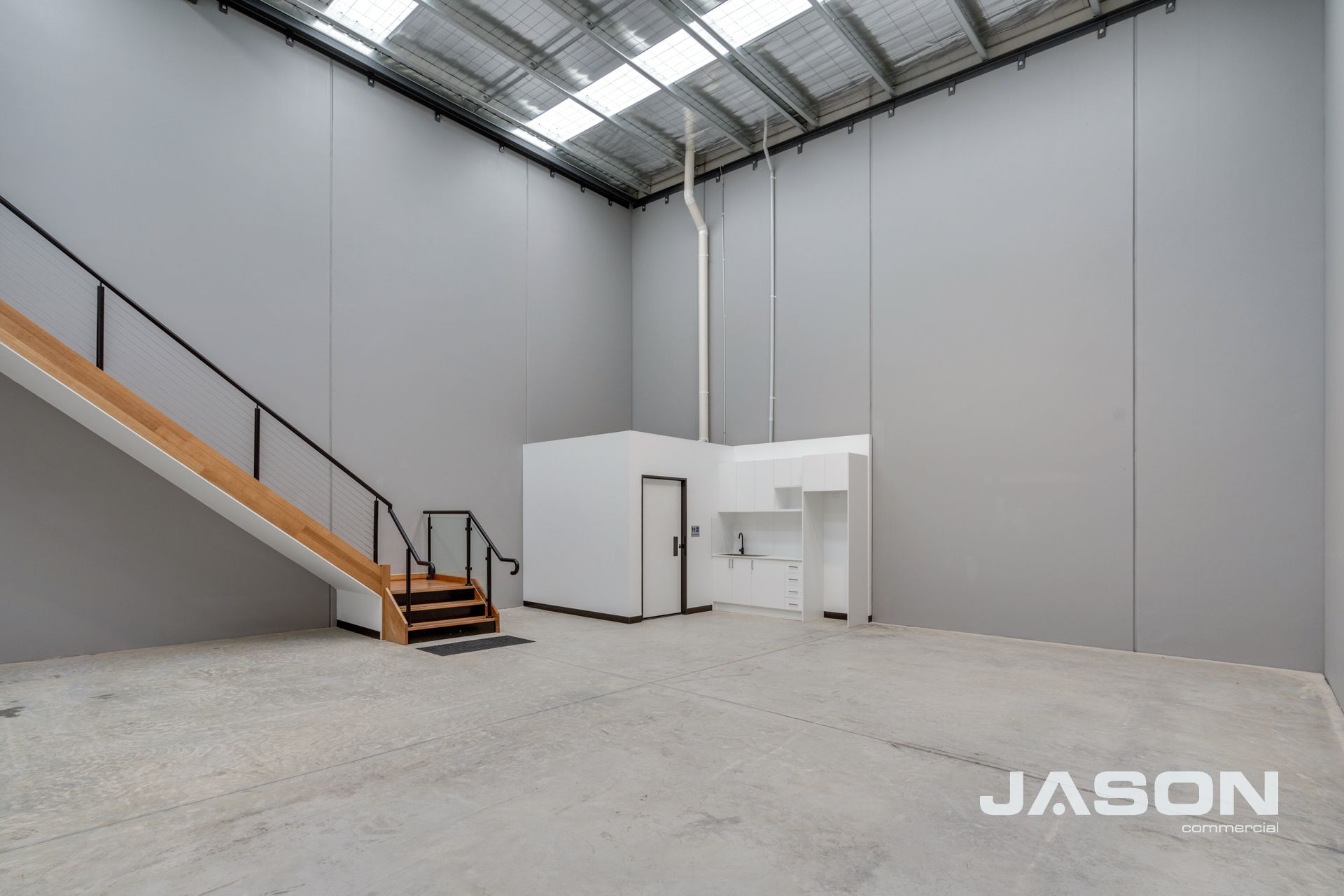 The property features an open-plan warehouse with excellent access via a large roller door, complemented by a first-floor office overlooking the warehouse area. The office is fitted with split system heating and cooling, commercial-grade carpet tiles, acoustic ceiling panels, and contemporary glass features, creating a comfortable and professional working environment.