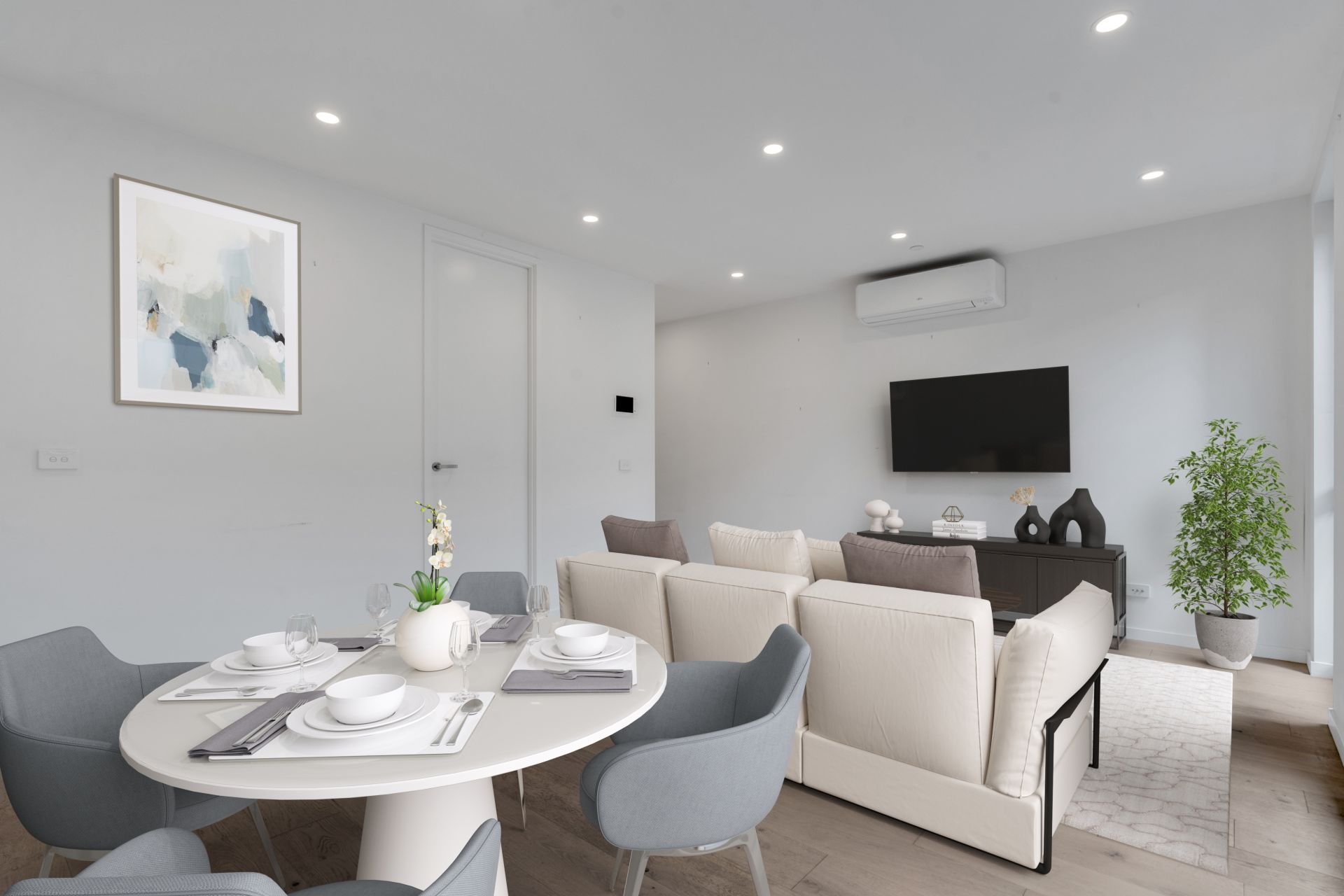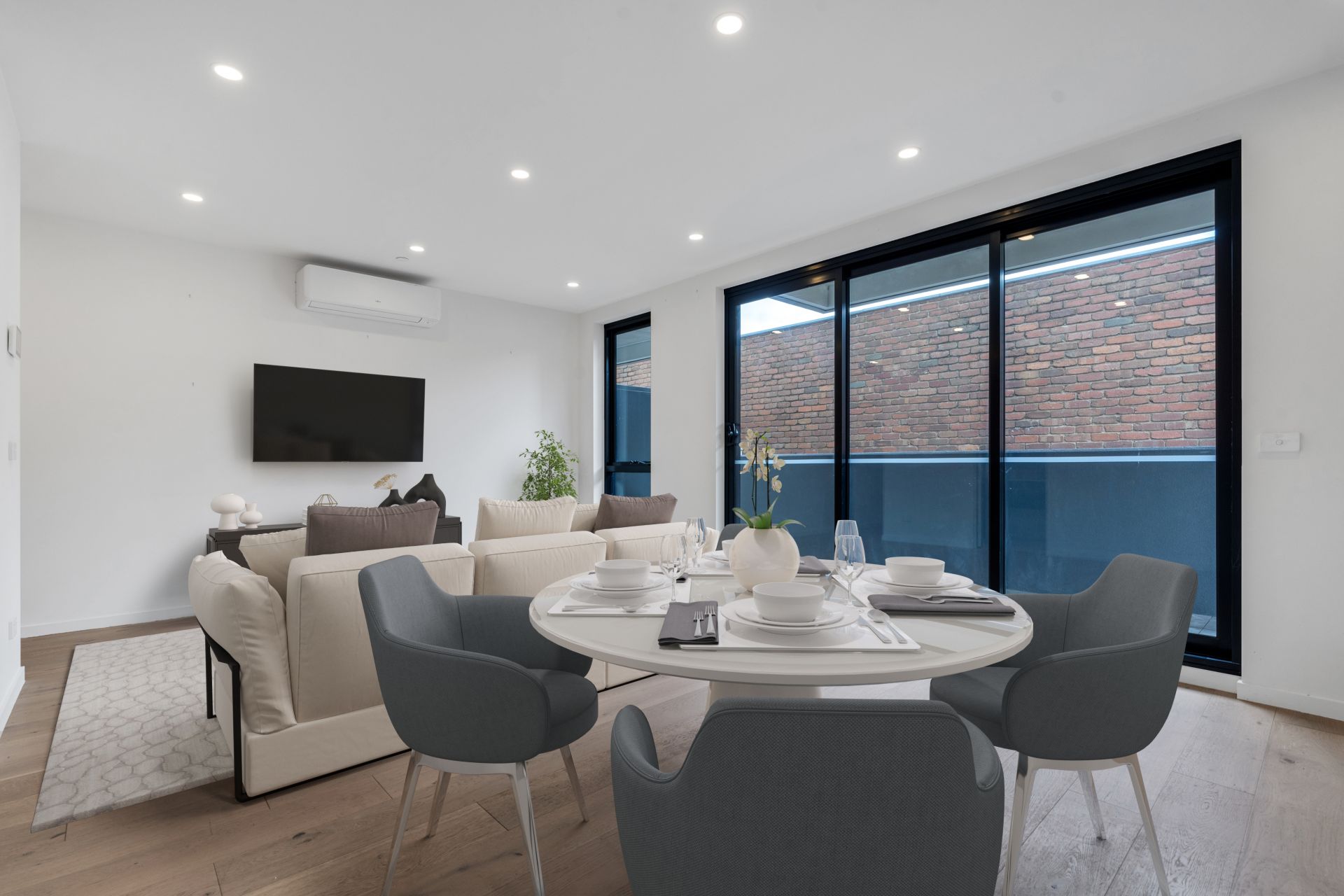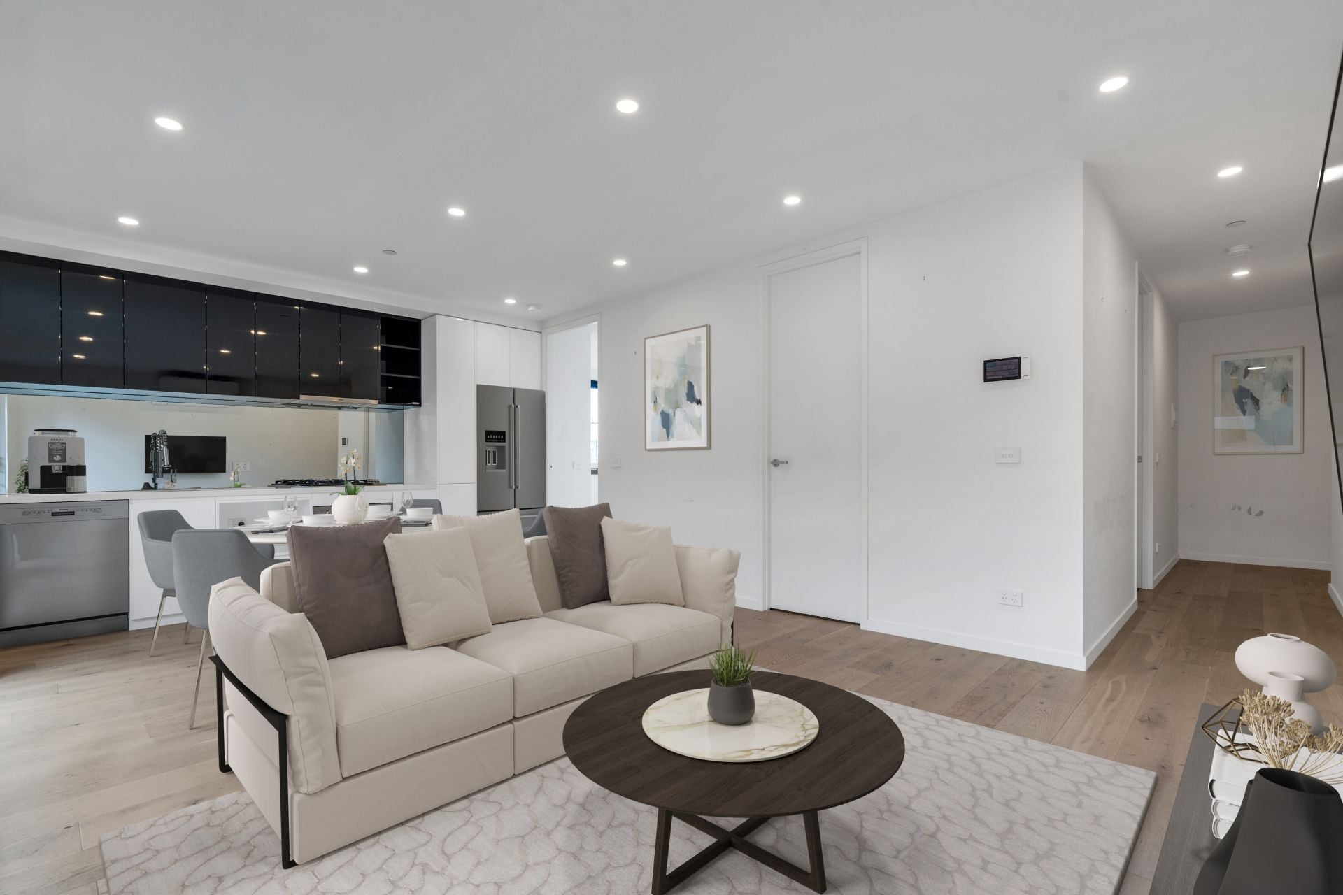 Featuring a spacious open-plan layout with sleek engineered oak floors, the apartment boasts an impressive kitchen equipped with quality appliances, stone benchtops, and a casual meals area. The inviting living room, complete with split-system heating and cooling, opens to a wraparound balcony, perfect for relaxing or entertaining.
