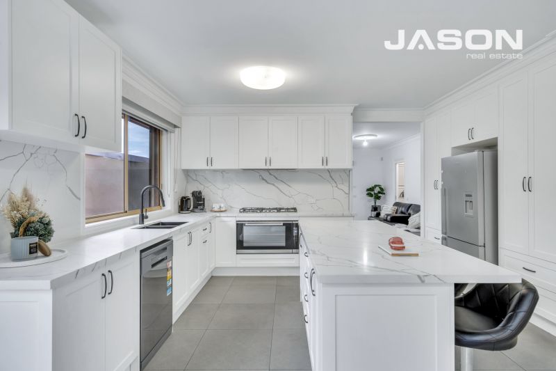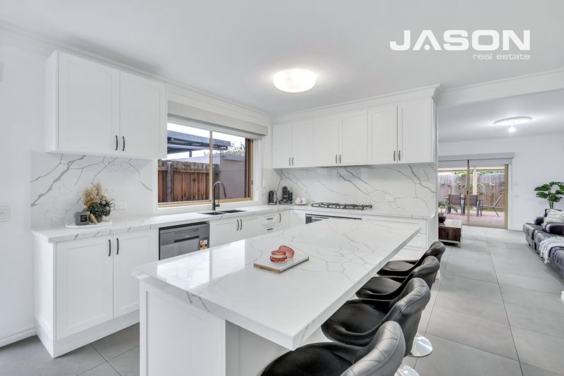 At the heart of the home is the beautifully appointed kitchen with stunning marble benchtops, splashbacks and a large central kitchen island. It comes fully equipped with a gourmet 900mm gas cooktop, under-bench oven, and dishwasher.