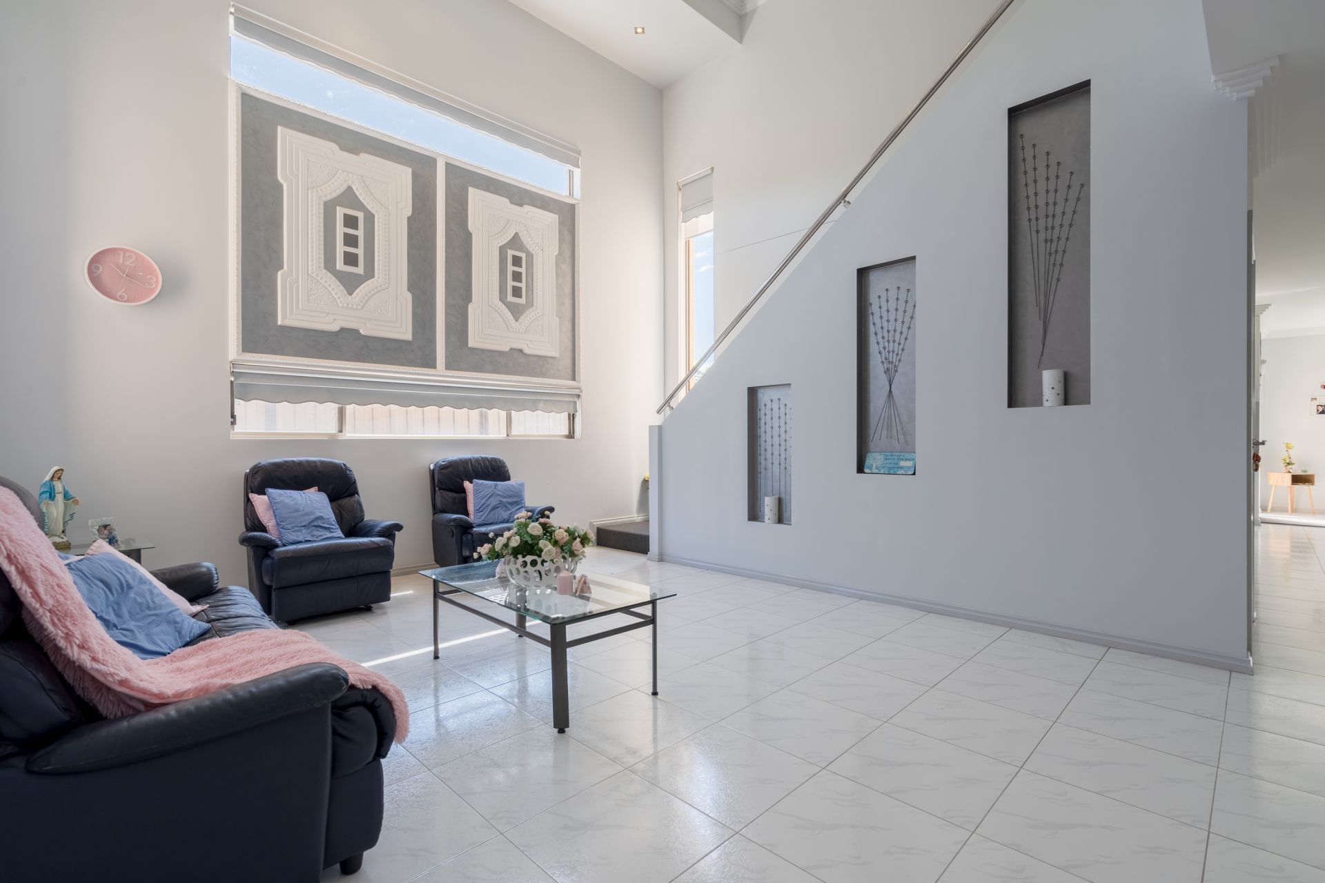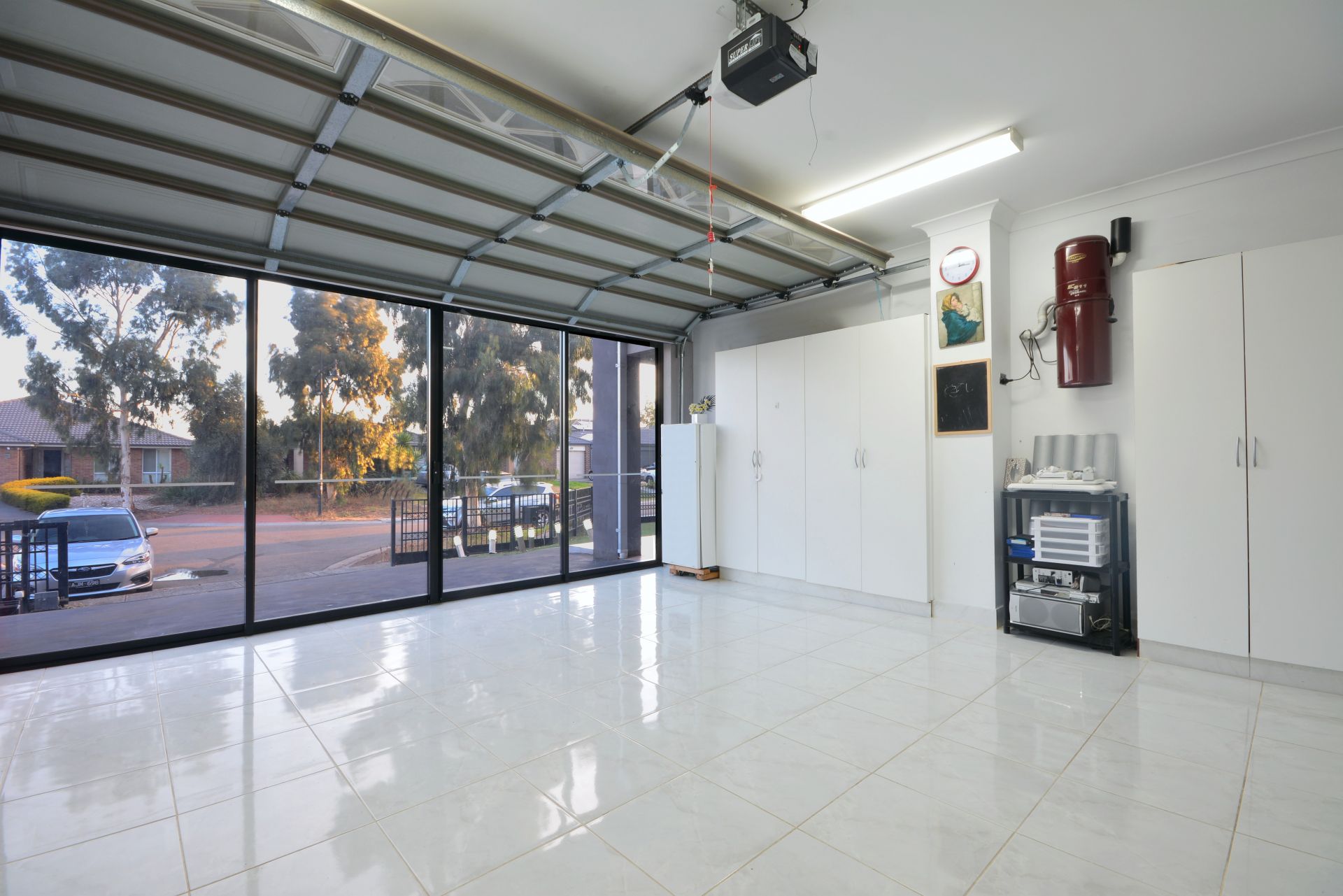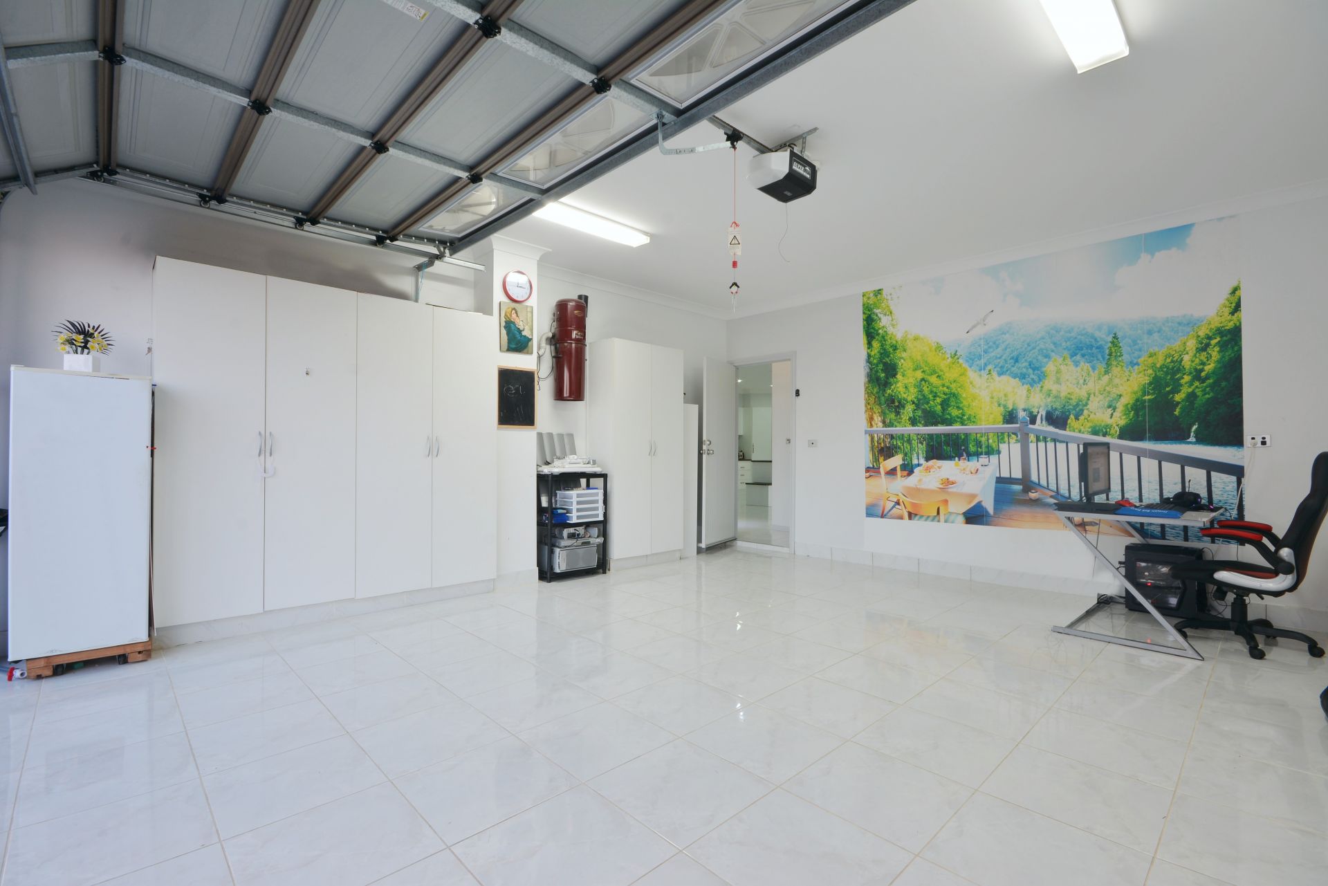 Automated front gate leads to a 3 car accommodation and double remote garage that include heating and cooling system, cupboards and tiled floorings, suitable for an office or beauty salon.