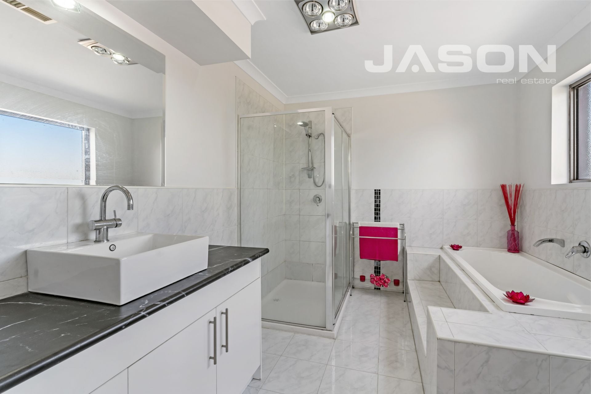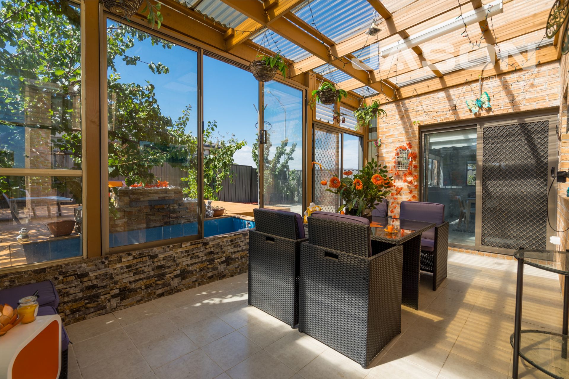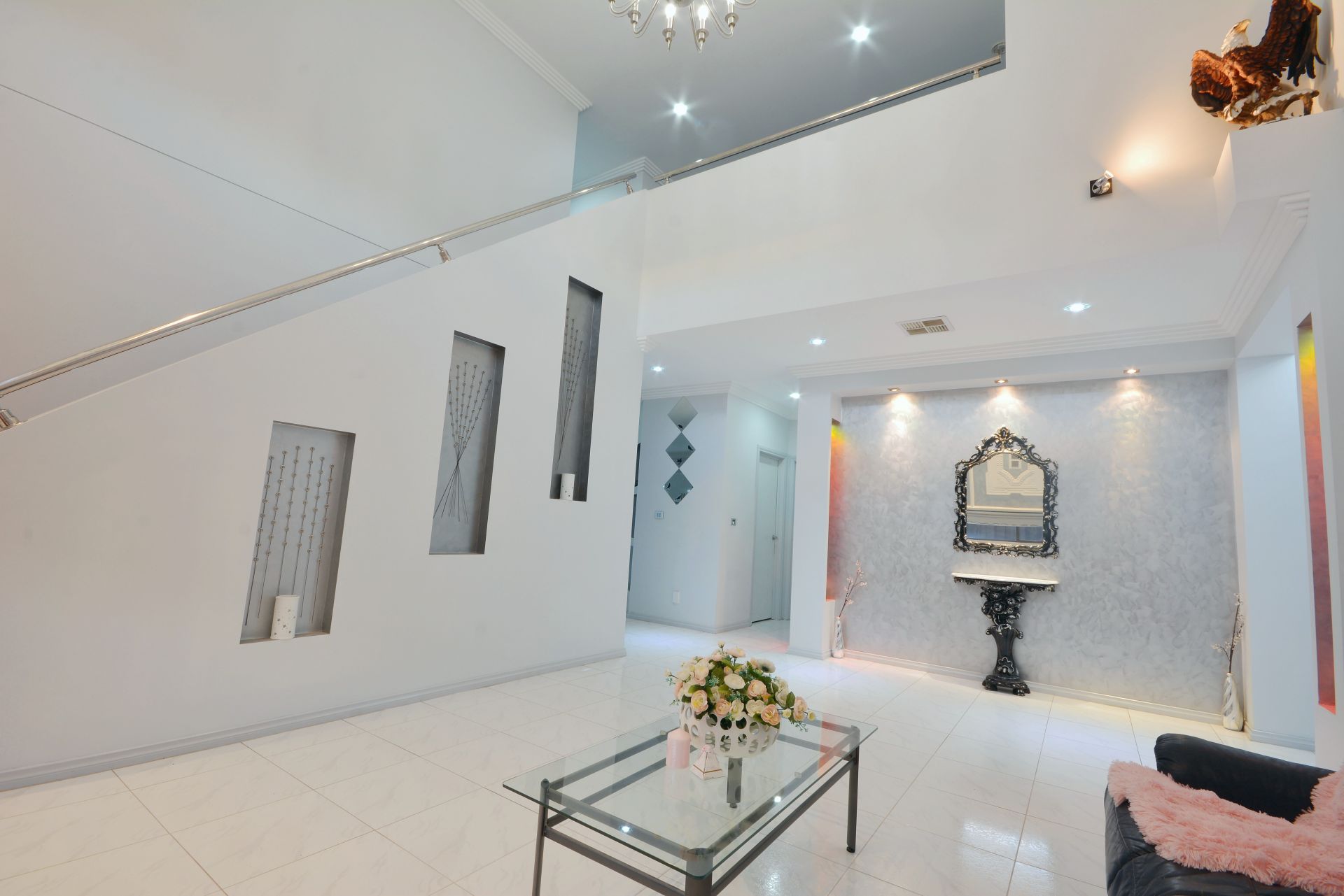 Automated front gate leads to a 3 car accommodation and double remote garage that include heating and cooling system, cupboards and tiled floorings, suitable for an office or beauty salon.