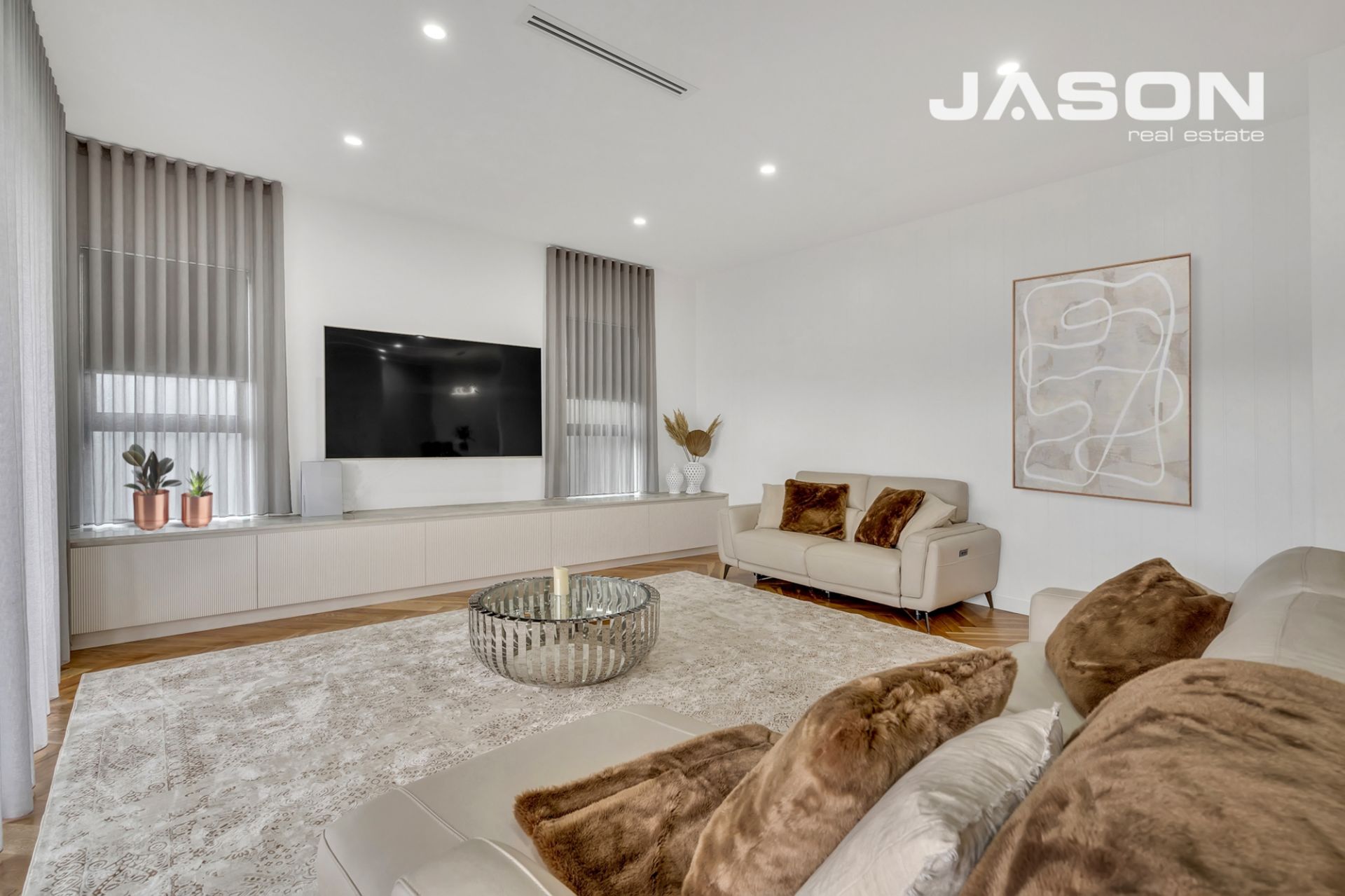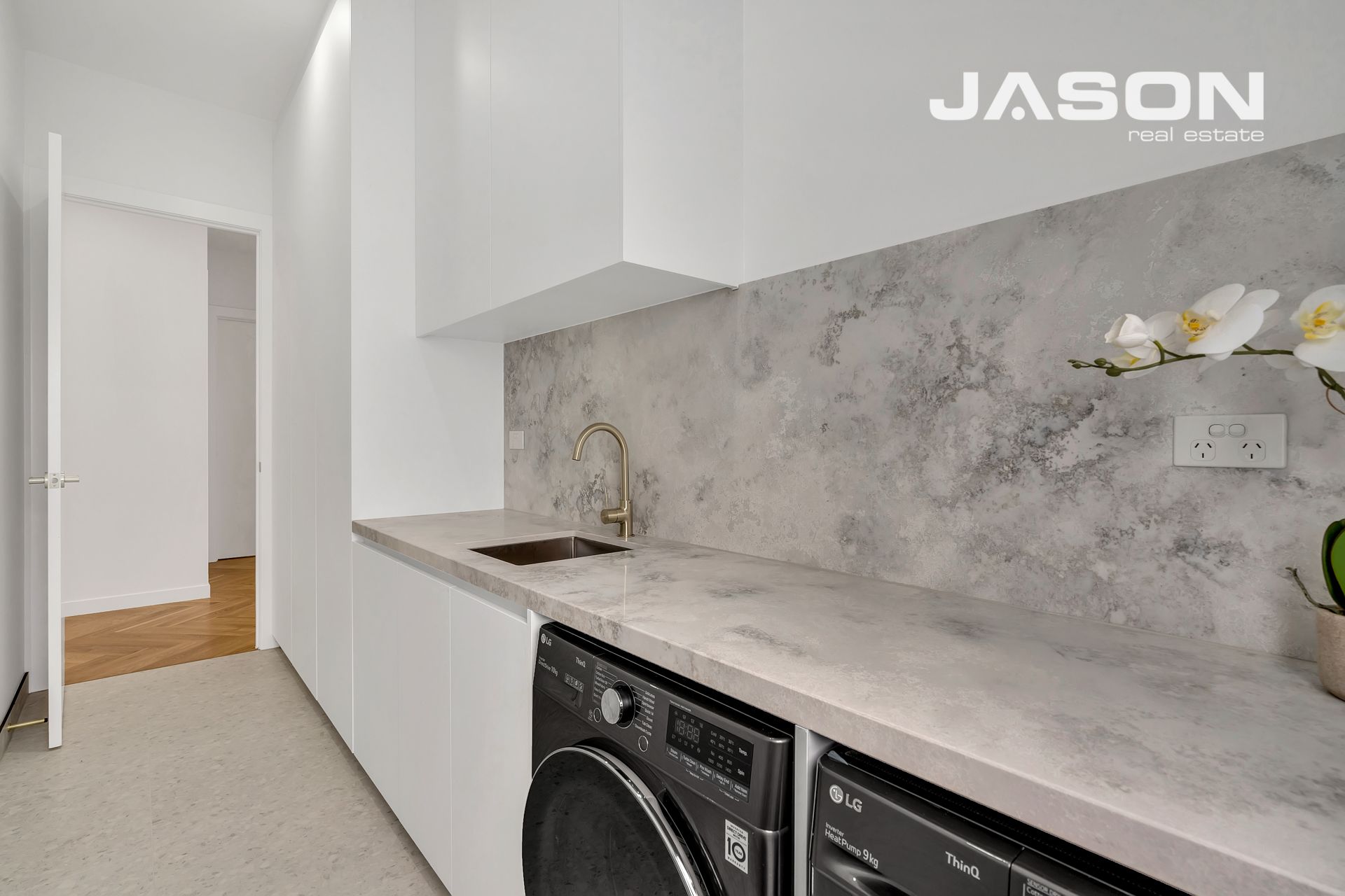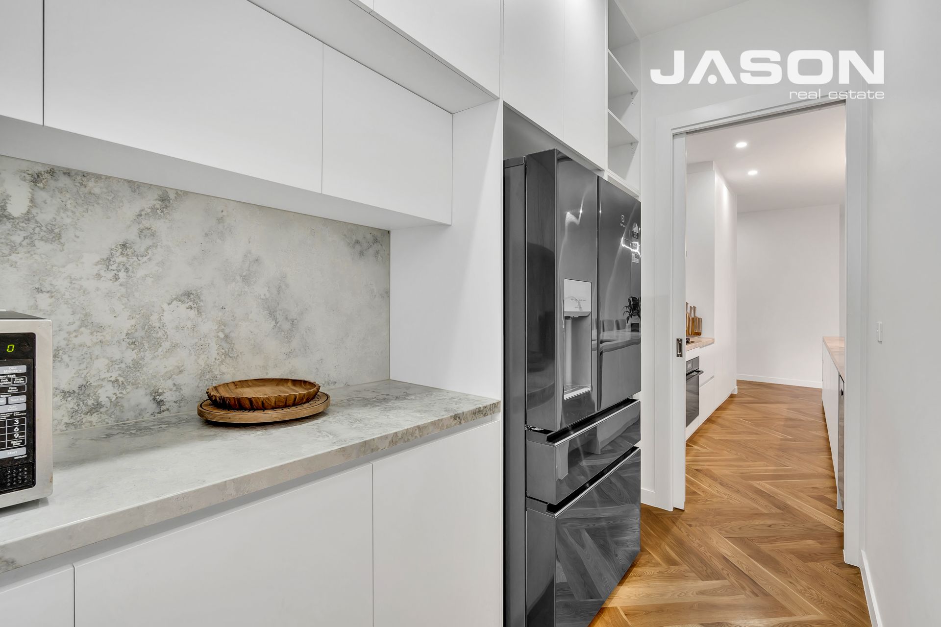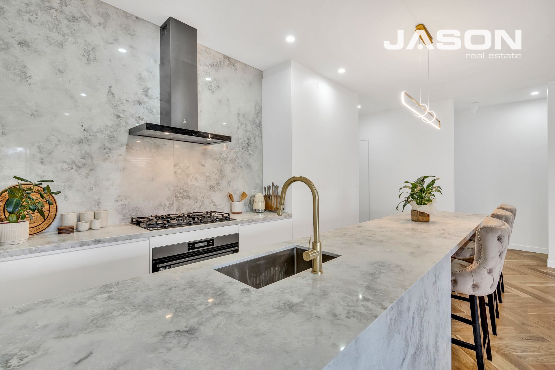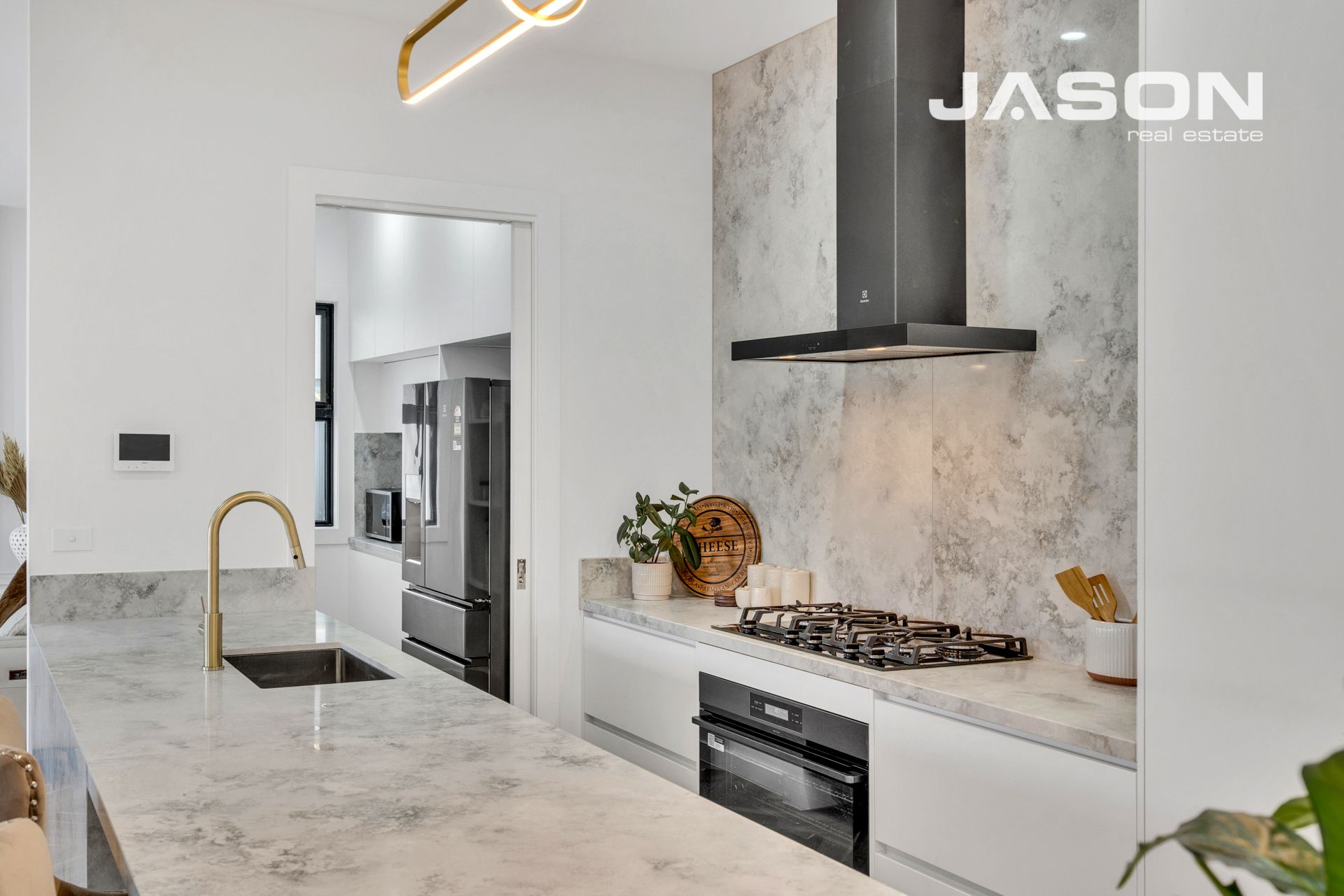 High ceilings and internal doors, fully tiled bathrooms, and beautiful herringbone flooring add a sense of grandeur while maintaining a comfortable ambience. A masterpiece of modern design, the kitchen features stunning waterfall stone benchtops, including a huge island, stone backsplash, sleek cabinetry, and a large butler's pantry. It is fully equipped to meet all your cooking and entertaining needs, including a 900mm gas stovetop, oven, and dishwasher.
