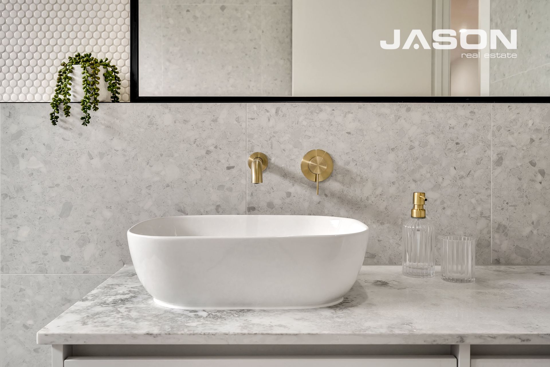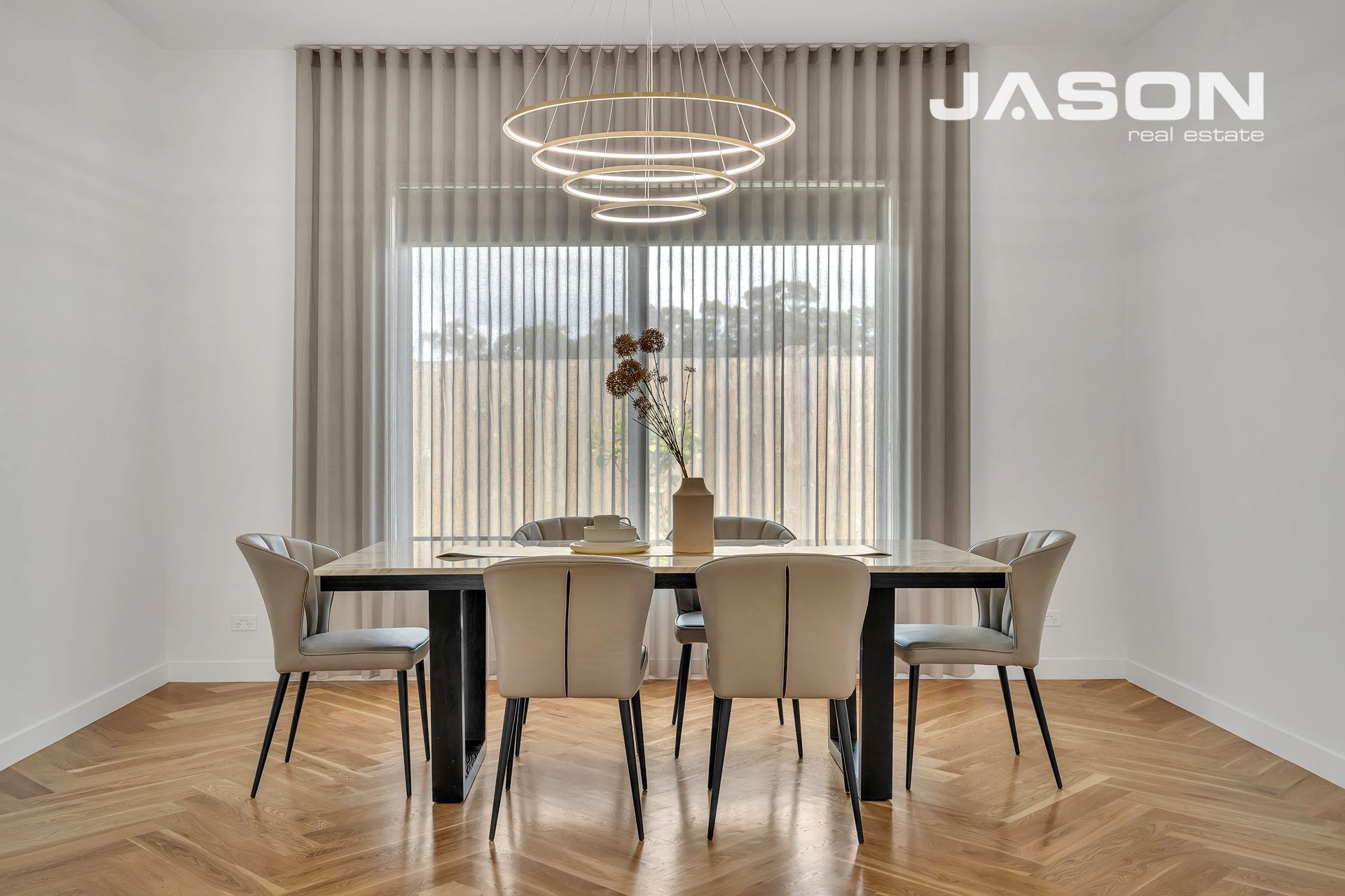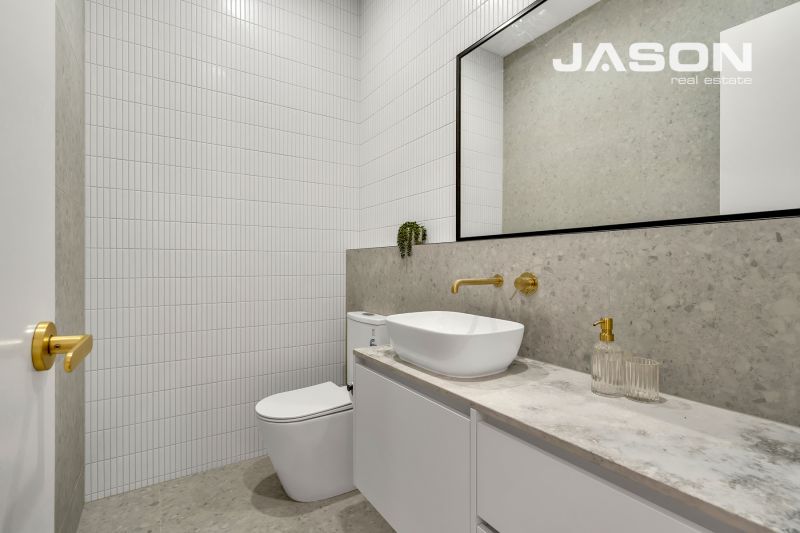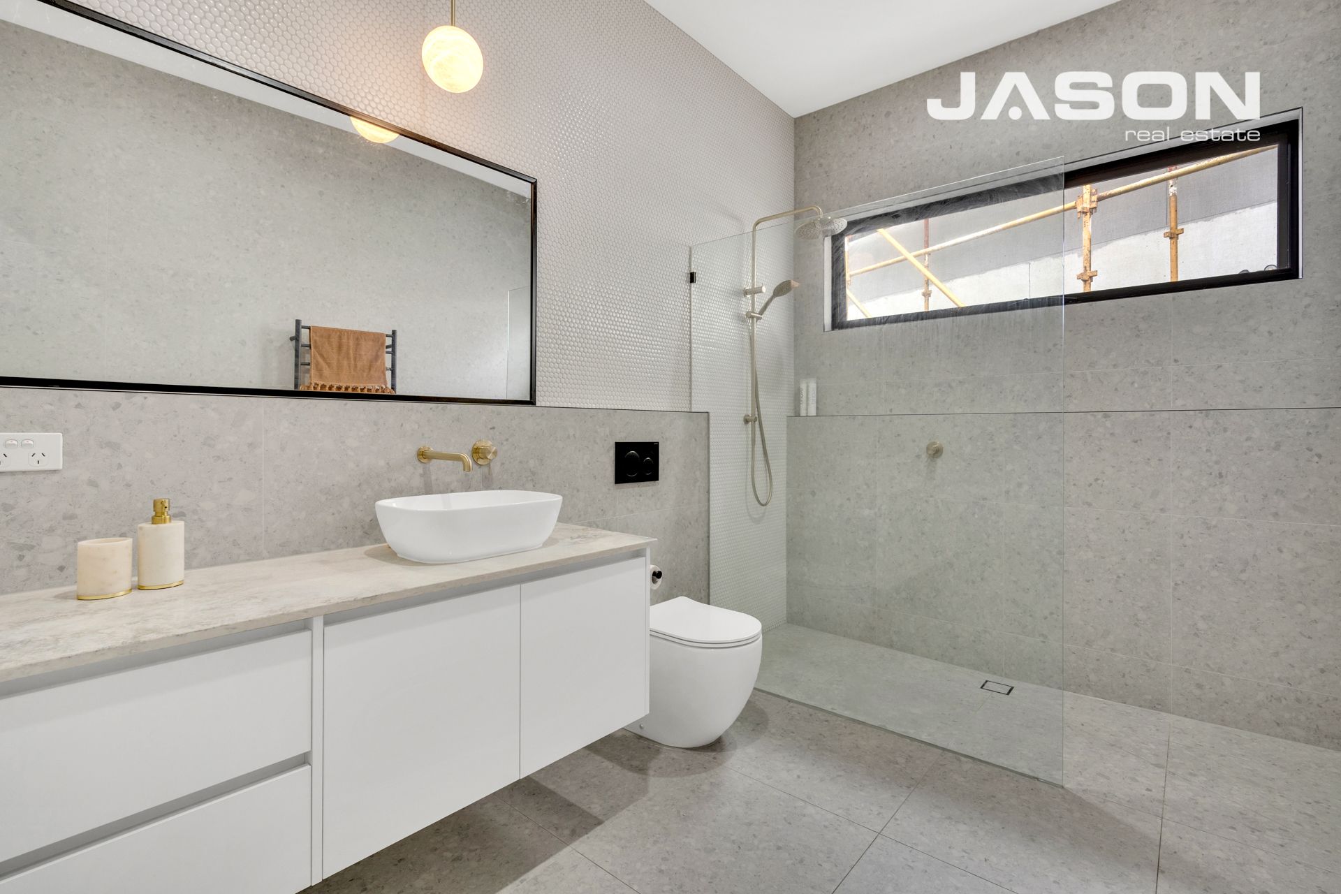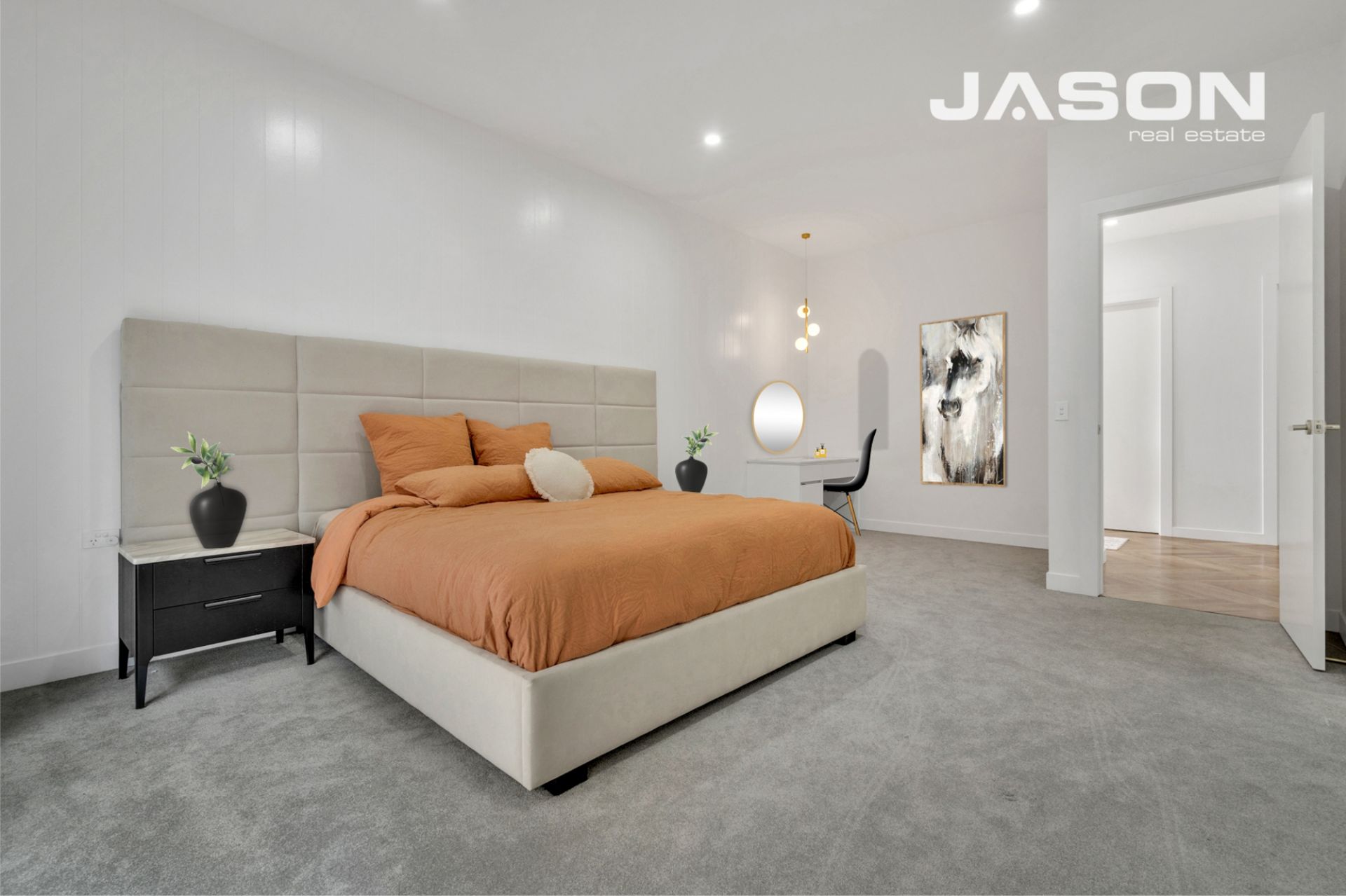High ceilings and internal doors, fully tiled bathrooms, and beautiful herringbone flooring add a sense of grandeur while maintaining a comfortable ambience. A masterpiece of modern design, the kitchen features stunning waterfall stone benchtops, including a huge island, stone backsplash, sleek cabinetry, and a large butler's pantry. It is fully equipped to meet all your cooking and entertaining needs, including a 900mm gas stovetop, oven, and dishwasher.