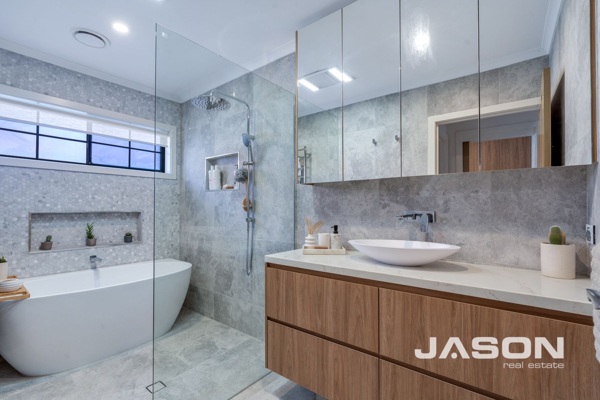 The master suite is a retreat of its own, featuring mirrored walk-in robes and a fully tiled ensuite with dual basins, a separate shower recess, and a spacious open shower. The remaining three bedrooms, along with a dedicated 5th bedroom/study, are all generously sized and equipped with mirrored built-in robes. Both the main bathroom and laundry exude modern elegance, fully tiled with sleek fixtures and a large frameless glass shower with a bathtub.