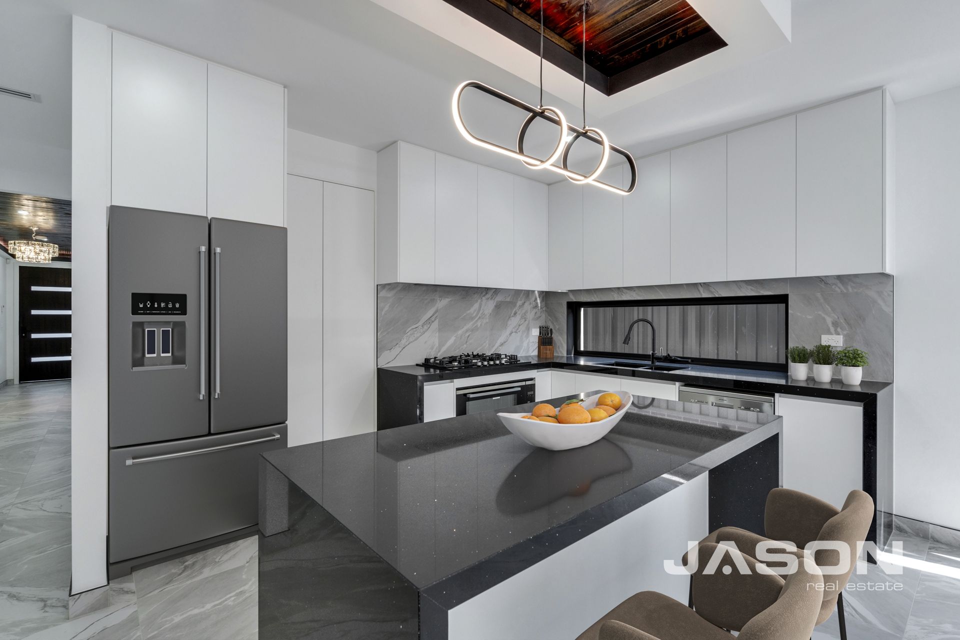 At the heart of the home lies a stunning kitchen and meals area, appointed with a striking black Caesarstone benchtop, 900mm gas cooktop, stainless steel appliances, and an abundance of storage – ideal for family living and entertaining.