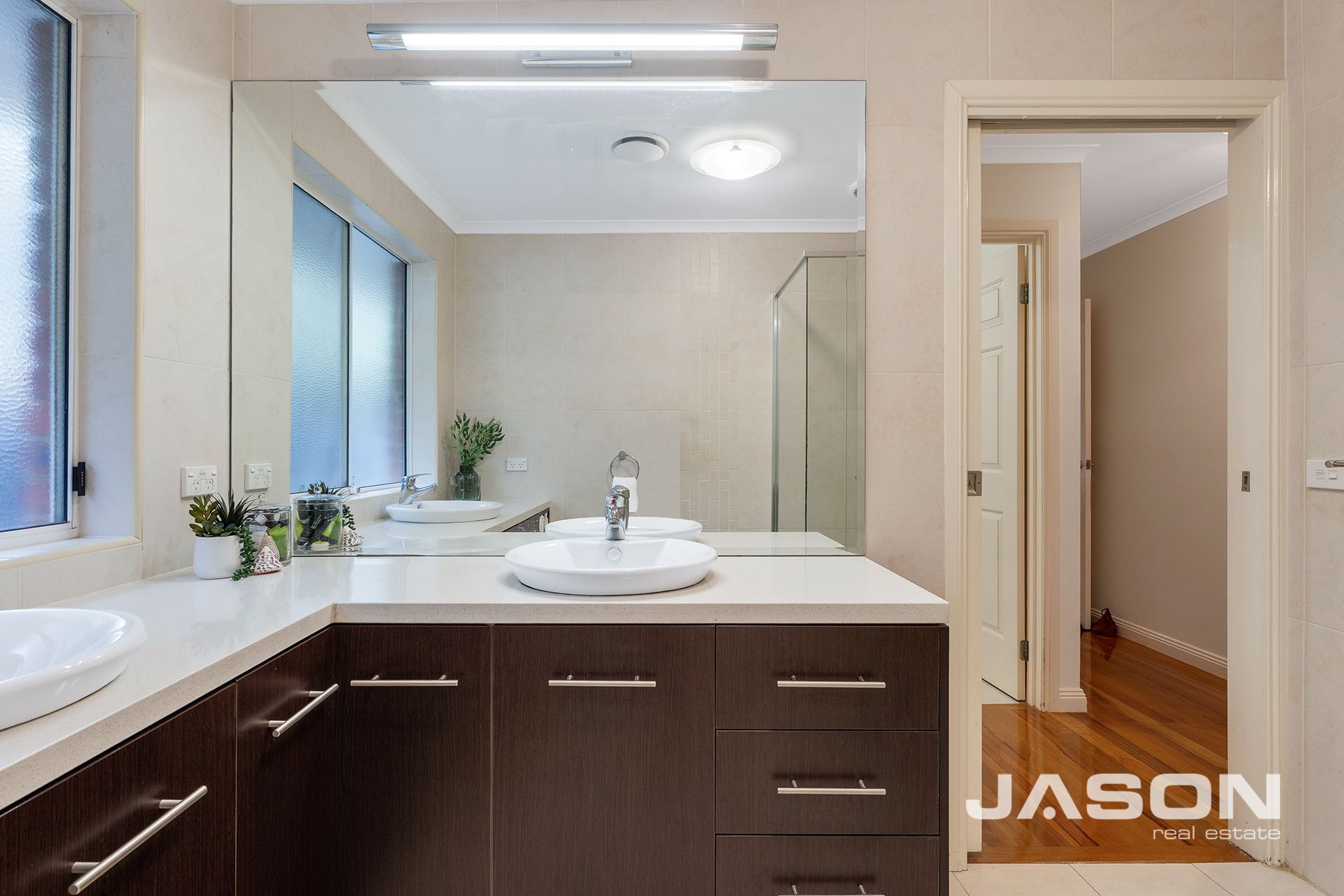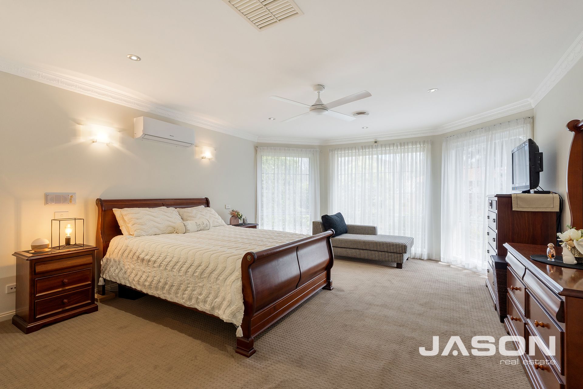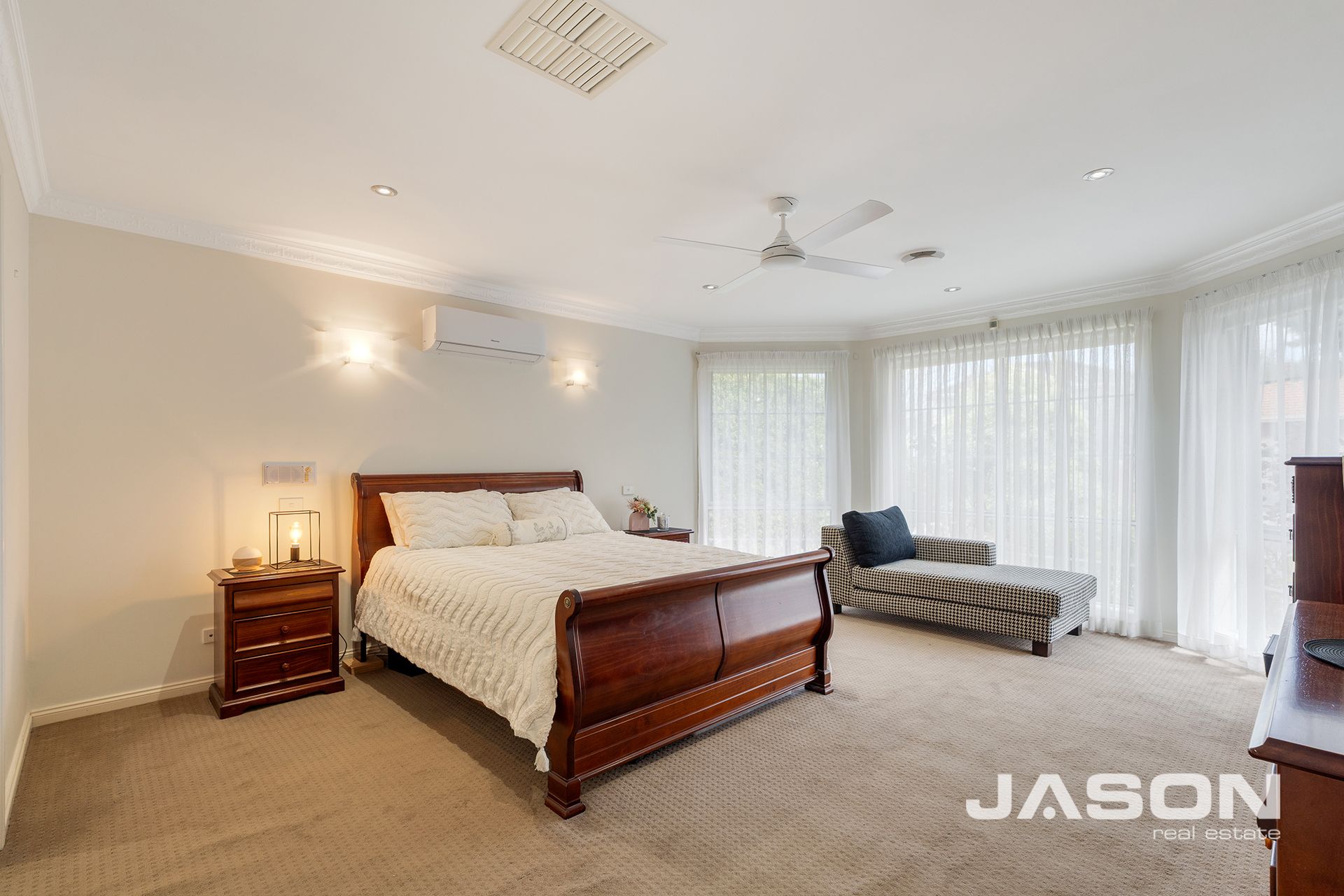 The master bedroom is filled with natural light and features a walk-in robe, split system heating and cooling, and a fully tiled ensuite. The remaining three bedrooms are all spacious with built-in robes and are serviced by a luxurious central bathroom with his-and-hers vanity, along with an additional powder room for guests.