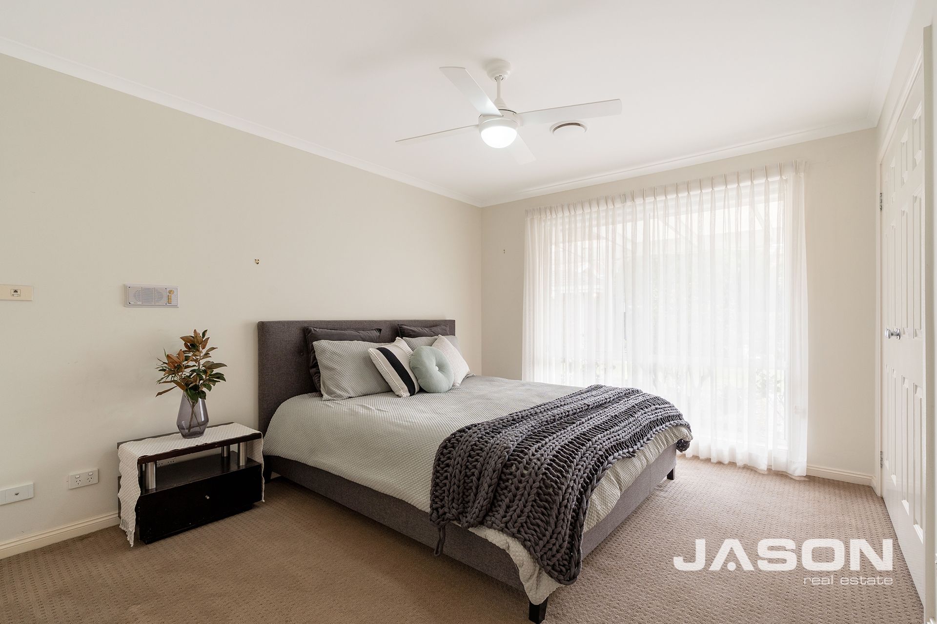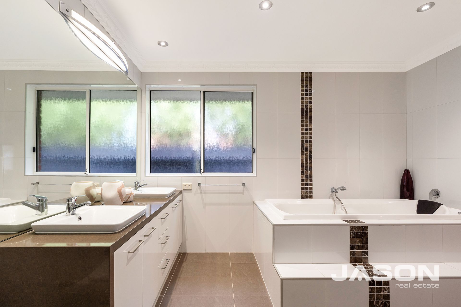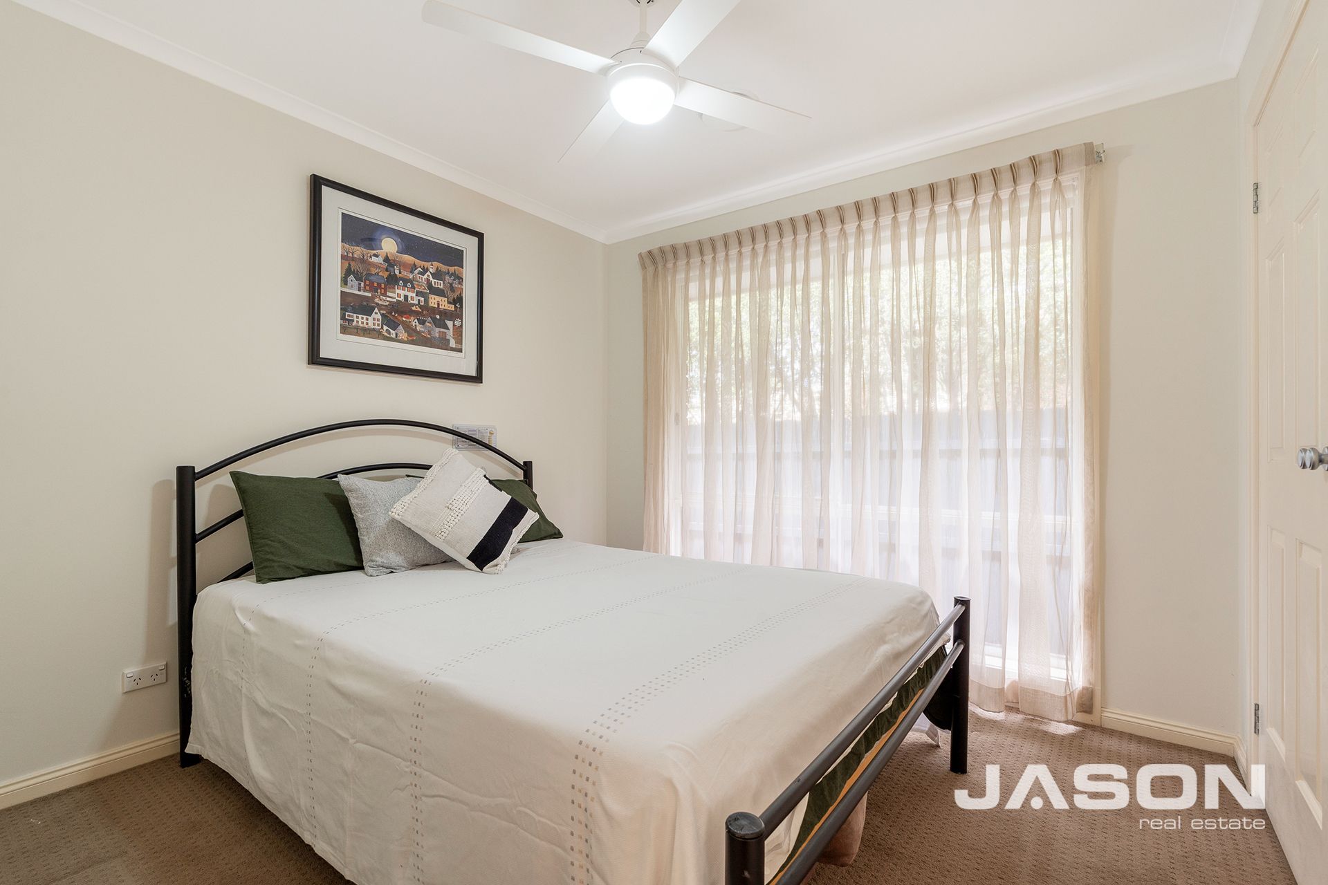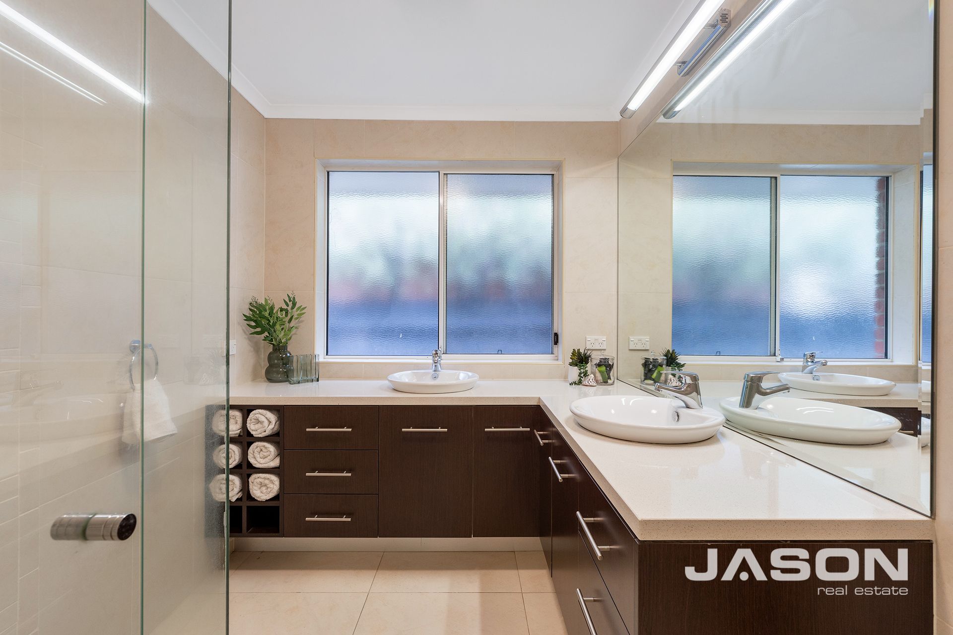 The master bedroom is filled with natural light and features a walk-in robe, split system heating and cooling, and a fully tiled ensuite. The remaining three bedrooms are all spacious with built-in robes and are serviced by a luxurious central bathroom with his-and-hers vanity, along with an additional powder room for guests.