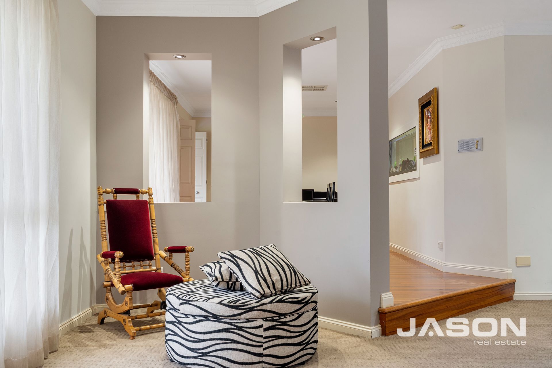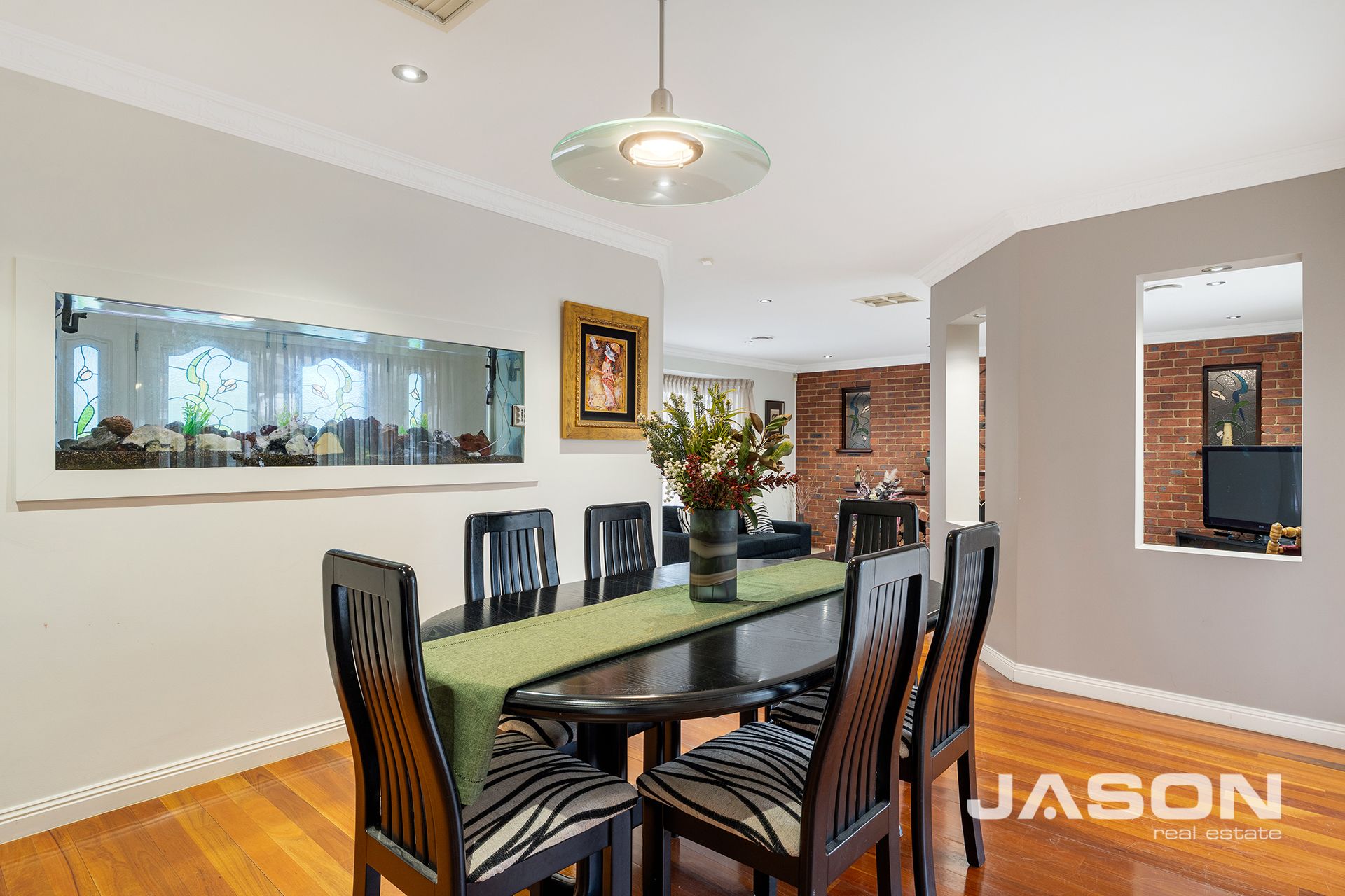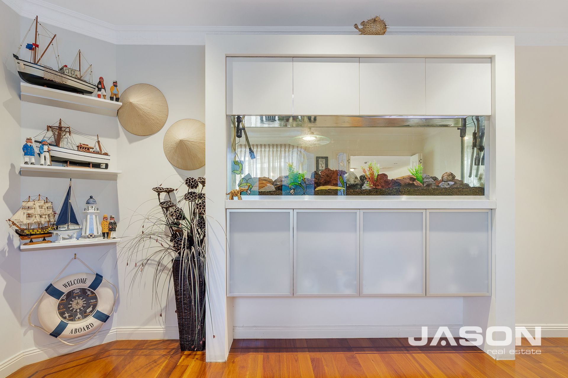 Additional features include ducted heating, evaporative cooling, ceiling fans in all bedrooms, a vacuum maid system, and the security of a video intercom. A striking built-in fish tank at the entrance adds a unique touch to the home's character and appeal.