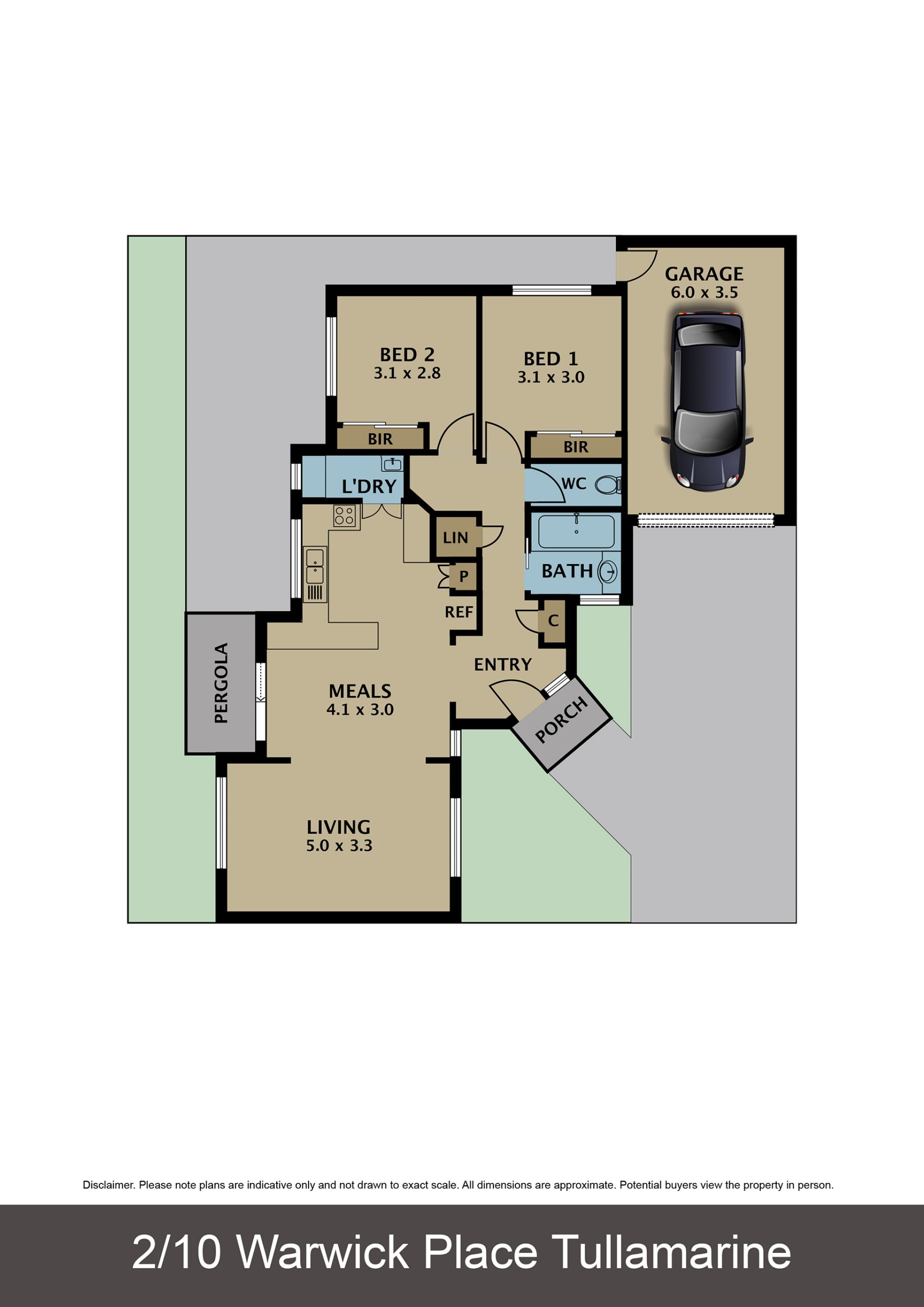 The casual dining flows into a large, inviting lounge and living room equipped with split-system heating and cooling, providing year-round comfort. The villa boasts two generously sized bedrooms with mirrored built-in robes and a modern, well-appointed bathroom. The convenience continues with an internal laundry for added functionality.