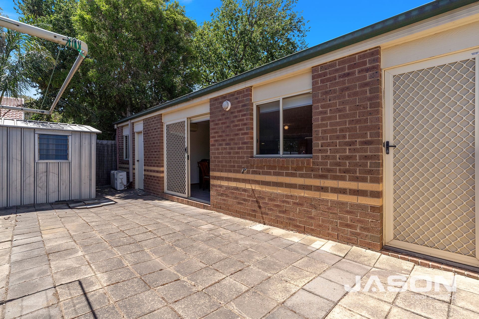 Accommodation includes two generous bedrooms with built-in robes, with the master bedroom enjoying dual access to the central bathroom. The bathroom features a double-sized shower, and a separate laundry adds further convenience.