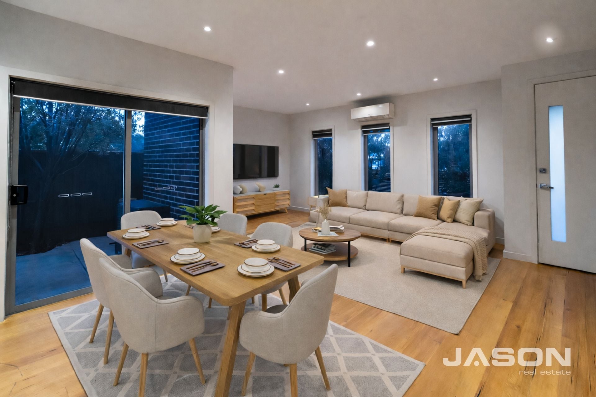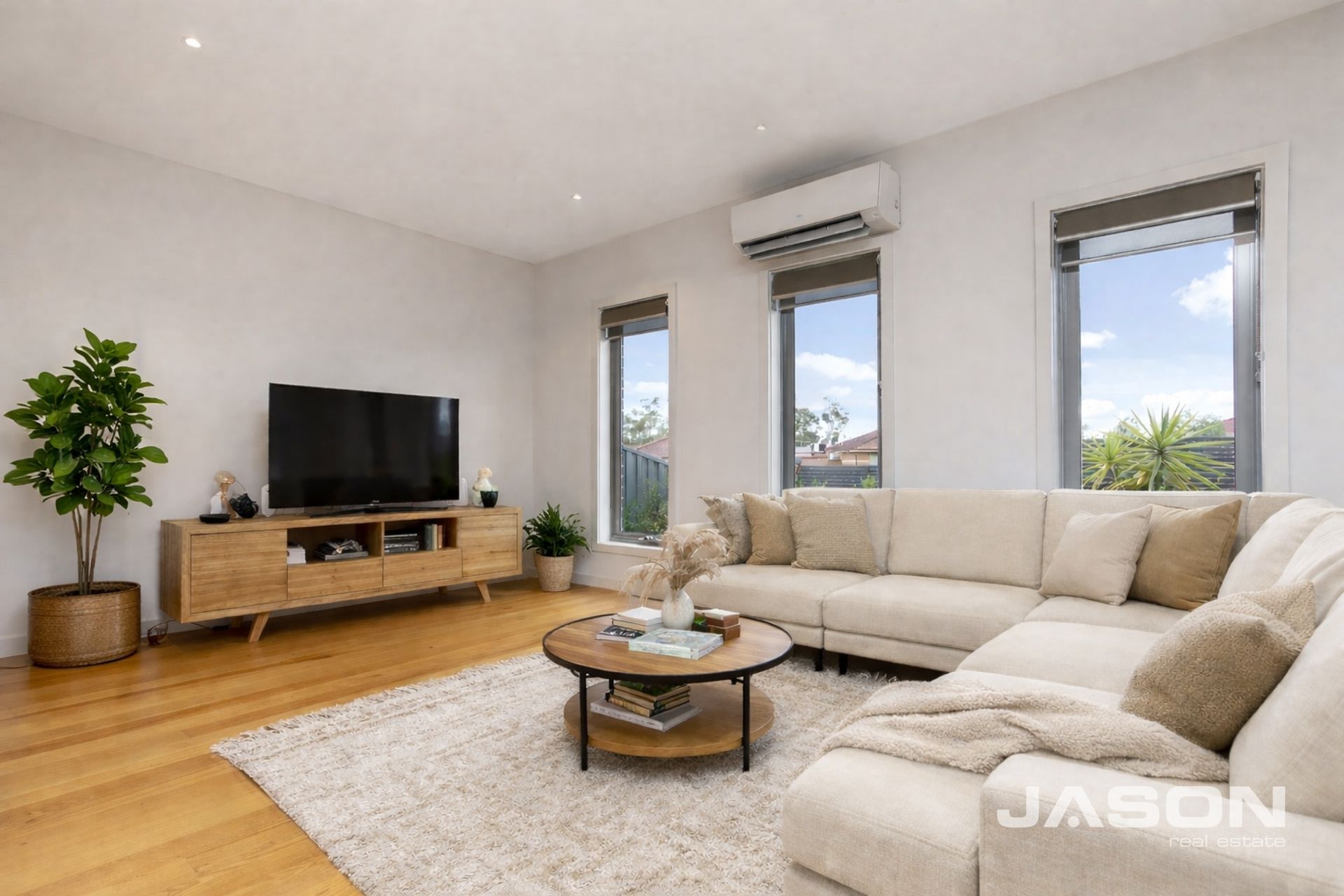 The generous living room is fitted with a split system air conditioner for year-round comfort and flows seamlessly to a separate dining area. The well-appointed modern kitchen adjoins the dining space and features a stone benchtop, gas hot plates, under-bench oven, rangehood, and dishwasher – perfect for everyday living and entertaining.